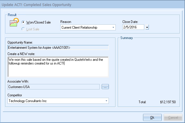 QuoteWerks Creates/Updates updates completed Sales Opportunities in Act!