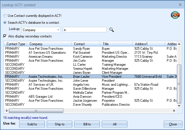 QuoteWerks searches the Act! database for a contact to use in the quote