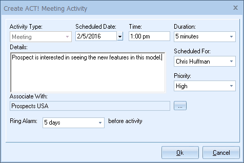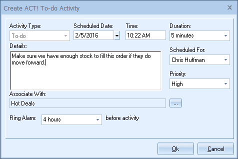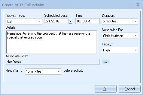 When creating or updating opportunities in Act!, you can add file attachments to the opportunity. You can either select a file using a file selection dialog, or choose a file that is already linked to the quote under the Links tab on the Quote WorkBook. This is really useful for attaching a PDF version of the quote to the Act! Opportunity. Having a PDF version of the quote is an advantage because anyone can then view the quote - they do not have to have QuoteWerks installed on their machine to view the quote. You can attach multiple PDF files to the opportunity, so you can easily attach the customer proposal, and a no frills plain vanilla version for the service technicians to follow, and basically anything else you could want.QuoteWerks schedules Follow up calls in Act!