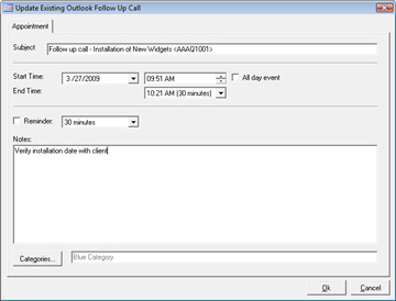 When saving a quote, QuoteWerks can automatically schedule a follow up call in Outlook as an Appointment Entry. If you already have a follow-up call scheduled for this quote, QuoteWerks will display the existing follow-up call so you can update it. By scheduling follow up calls, you increase your chances of closing the sale!