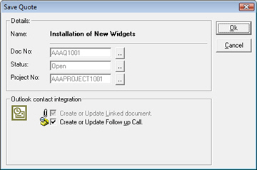 When saving a quote, QuoteWerks can automatically create a linked document record in Outlook under the Activities tab as a Journal Entry.