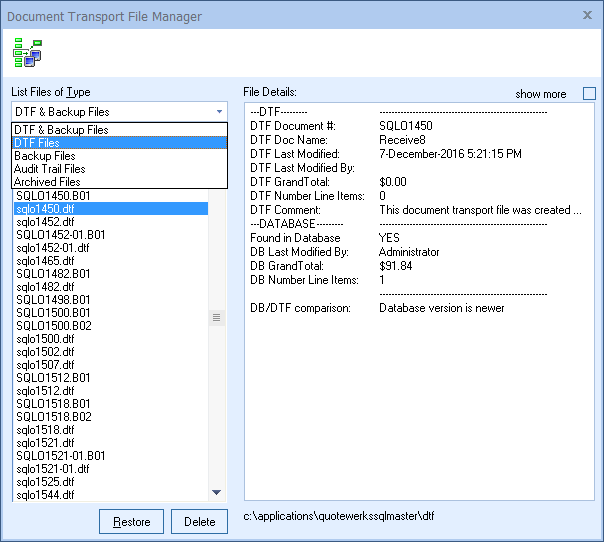 This is used to troubleshoot issues with DTF files. You can also see data in backup files from the document transport files, to compare with the current database information and analyze when different changes were made, or see data in archived files to find documents to bring back into the database.