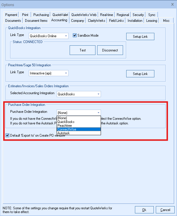 With this drop-down box, you'll select QuickBooks, Sage 50 (Peachtree), Autotask, or ConnectWise. When you export your document to your accounting package, a purchase order will automatically be exported to your selected program.