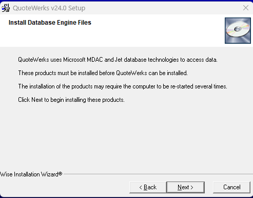 Step 4: Starting with 4.0, QuoteWerks uses Microsoft MDAC and Jet database technologies to access data. As a result, these products must be installed. The QuoteWerks setup program will install these for you. This may require a reboot during installation.