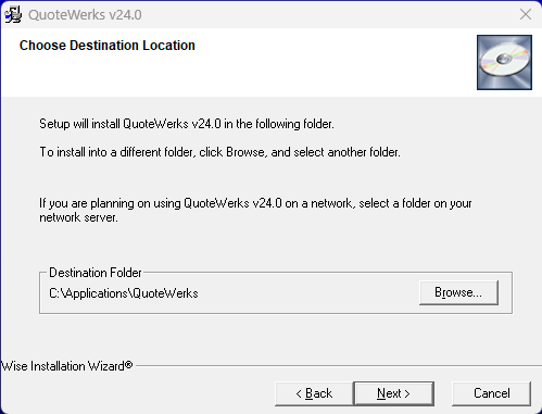 Step 7: The Choose Destination Location window will appear next. The default destination folder is C:\Applications\QuoteWerks