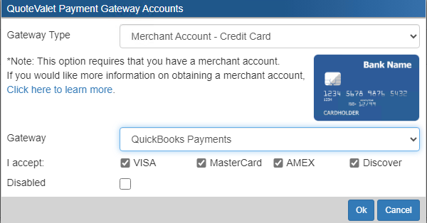 This topic covers how to set up QuoteValet payment processing to work with QuickBooks Payments.
