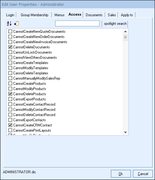CannotCreateNewQuoteDocuments: Revokes the user’s ability to create a new, blank quote document. If this setting is checked, the user will need to load from a template. CannotCreateNewOrderDocuments: Revokes the user’s ability to create a new, blank order document. If this setting is checked, the user will need to load from a template. CannotCreateNewInvoiceDocuments: Revokes the user’s ability to create a new, blank invoice document. If this setting is checked, the user will need to load from a template.. CannotDeleteDocuments: Revokes the user’s ability to Delete any document. CannotUnlockDocuments: Revokes the user’s ability to unlock documents that have been locked by another user. On the Sale Info tab of the quote workbook, there is a “Locked” checkbox. If this access right is set, then the user will not be able to uncheck this checkbox. CannotViewOthersDocuments: Revokes the user’s ability to view other user’s documents. When this access right is set, the icons available for searching on the File -> Open window are limited to the user’s own documents. Additionally, when a search is performed, only the documents that belong to the user will be returned. When a customer and/or product price history search is run, and this access right is set, the results will be limited to the user’s documents. CannotCreateTemplates:Revokes the user’s ability to create document templates. Templates are created by selecting the template option on the File -> Save window. CannotModifyTemplates: Revokes the user’s ability to modify document templates. When a template is opened using the File -> Open menu, and changes are made to the template, the user will not be allowed to save the changes. CannotDeleteTemplates: Revokes the user’s ability to delete document templates. When a template is opened using the File -> Open menu, and the user tries to select the File -> Delete menu, the user will not be allowed to delete the template. CannotManuallyModifySalesRep: Revokes the user's ability to change the Sales Rep field. CannotCreateProducts: Revokes the user’s ability to create new products. On the Product Lookup window the user will not be allowed to click on the [New] button. CannotModifyProducts: Revokes the user’s ability to modify existing products. On the Product Lookup window the user will not be allowed to click on the [Edit] button. CannotDeleteProducts: Revokes the user’s ability to delete existing products. On the Product Lookup window the user will not be allowed to click on the [Delete] button. CannotExportProducts: Revokes the user’s ability to export products out of a QuoteWerks product database to a text file. On the Products -> Setup Product Data Sources menu, when right clicking on the product data source, the user will not be allowed to select the “Export” menu item. CannotCreateContactRecord: Revokes the user’s ability to Create or Clone contacts with the QuoteWerks contact database. CannotModifyContactRecord: Allows the user to click on the edit button to view a contact record, but prevents the user from saving changes to the contact record with the QuoteWerks contact database. CannotDeleteContactRecord: Revokes the user’s ability to Delete contacts from the QuoteWerks contact database. CannotExportContacts: Revokes the user’s ability to export contacts out of a QuoteWerks native contact database to a text file. On the Contacts -> Setup Contact Manager menu, when QuoteWerks is selected under the “Select Contact Manager” section, the user will not be allowed to click on the [Export Contacts] button. This prevents the user from exporting your entire customer list. CannotCreateCRMContact: Prevents the user from being able to create contacts in the CRM under the Quote Workbook's Sold to / Ship to tab. CannotCreatePrintLayouts: Revokes the user’s ability to create new print layouts. On the Layouts tab of the File -> Print/E-mail/Deliver window, the user will not be allowed to click on the [New] or [Clone] buttons. CannotModifyPrintLayouts: Revokes the user’s ability to modify existing layouts. On the Layouts tab of the File -> Print/E-mail/Deliver window, the user will not be allowed to click on the [Edit] or [Rename] buttons. CannotDeletePrintLayouts: Revokes the user’s ability to delete existing layouts. On the Layouts tab of the File -> Print/E-mail/Deliver window, the user will not be allowed to click on the [Delete] button. CannotUsePrintLayoutTypeDifferentThanDocType: Revokes the user’s ability to use a layout type different from the currently open document. For example, if this access right is set, the user will not be allowed to use an Order layout type for a quote document and vice-versa. The user will only be able to use the layout that matches the document type. CannotUseOrderPrintLayout: Revokes the user’s ability to use Order layout files on the File -> Print/E-mail/Deliver window. CannotUseInvoicePrintLayout: Revokes the user’s ability to use Invoice layout files on the File -> Print/E-mail/Deliver window. CannotUseSOPrintLayout:Revokes the user’s ability to use Sales Order layout files on the File -> Print/E-mail/Deliver window. CannotUsePOPrintLayout: Revokes the user’s ability to use Purchase Order layout files on the File -> Print/E-mail/Deliver window. CannotAddCoverPages: Revokes the user’s ability to add a cover page document on the Cover Page tab of the File -> Print/E-mail/Deliver window. CannotModifyCoverPages: Revokes the user’s ability to modify a cover page document on the Cover Page tab of the File -> Print/E-mail/Deliver window. CannotDeleteCoverPages: Revokes the user’s ability to delete a cover page document on the Cover Page tab of the File -> Print/E-mail/Deliver window. CannotMaintainLiterature: Revokes the user’s ability to rename/create a new folder on the Literature tab of the File -> Print/E-mail/Deliver window. CannotAddLiterature: Revokes the user’s ability to insert a literatur