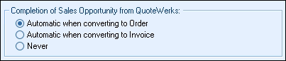 QuoteWerks provides you with the flexibility to control when a sales opportunity created by QuoteWerks in ACT! for Web will be converted to a completed sale. The ACT! for Web sales opportunity can be completed by QuoteWerks when converting to an order (File -> Convert to Order menu), an invoice (File -> Convert to Invoice menu), or Never. Never means QuoteWerks will never attempt to complete the Opportunity, the Opportunity will need to be manually updated within ACT! for Web. This provides a greater level of control for sales managers or administrators who would prefer to manually close the opportunities from within ACT! for Web rather than have QuoteWerks automatically close them.