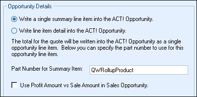 If you select this option, QuoteWerks will write a single summary line item with just the totals into the ACT! for Web Opportunity.