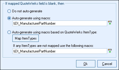 To use the auto-generation feature, select an option other than ManufacturerPartNumber from the Map QuoteWerks Field drop-down box, then click the [PartNumber generation options] button.