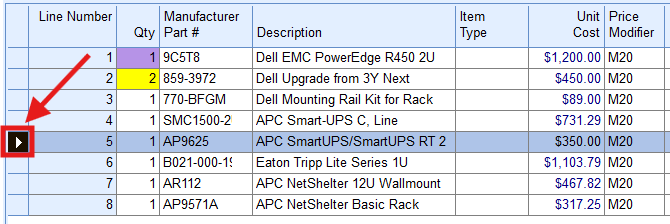 ]. This area is called the record selector; when you click on the record selector, the entire line item will highlight. An item is in focus when the arrow next to it is white, as shown below: