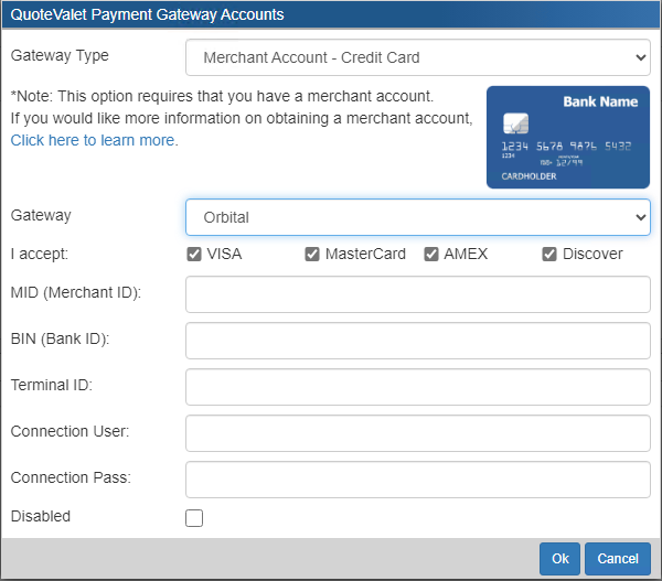 This topic covers how to set up QuoteValet payment processing to work with Chase Patementech/Orbital Gateway. To set up the integration, you will need 3 required pieces of information and two possible additional fields.