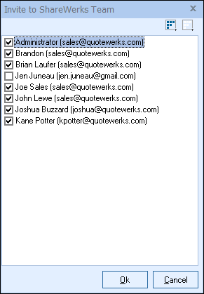 This will display a list of your QuoteWerks users. Select which users you would like to invite to ClarityWerks. After you click OK, an automated email will be generated for each user inviting them to setup their ClarityWerks account. Once your users have accepted the invite to the ClarityWerks account, they will need to add their own credentials to their QuoteWerks user settings under Tools-> My Preferences-> ClarityWerks tab.