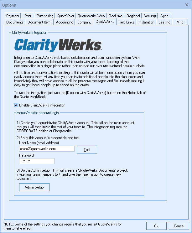 First, ensure you have signed up for a ClarityWerks account on the ClarityWerks website. Once you have those credentials, enter them in QuoteWerks on the ClarityWerks tab.