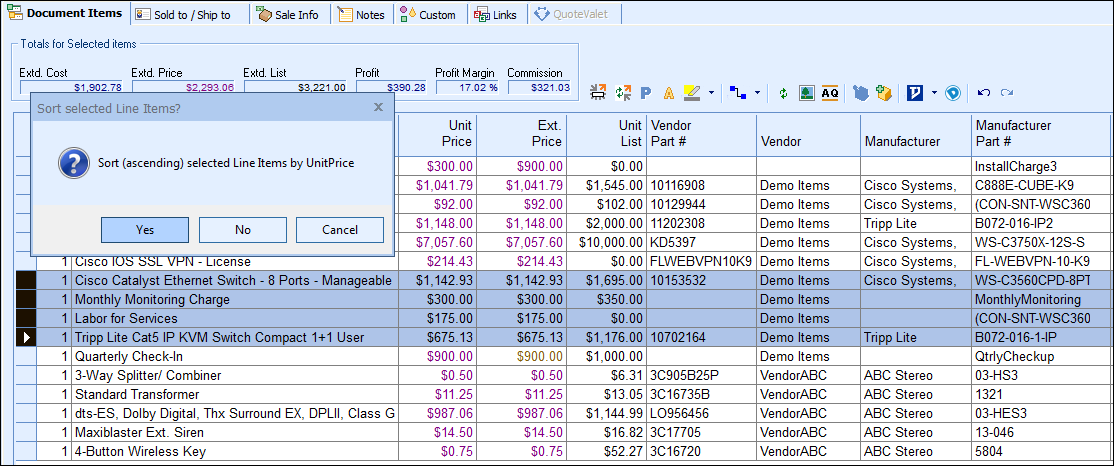 The DocumentItem columns can be sorted by by clicking on the column name. This will automatically prompt you to sort the columns by "Ascending". If you wish to sort by "Descending" instead, simply hold the SHIFT key before clicking on the column name. Users can also specify which columns to sort by pre-selecting them. For example, if you select 4 of the 16 line items in a document, only the selected line items will sort. Users can select both contiguous range of lines or single select lines to sort.