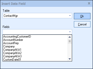 Fields in the ContactMgr table are found in your contact manager. The contact manager you are using in conjunction with QuoteWerks will determine what fields are listed here. QuoteWerks will list the default fields provided by your contact manager; if a field from your contact manger is not listed, then you can simply type in the field name. When layout is executed, QuoteWerks will retrieve the data from that field. Because there are many contact managers, we will not list the fields available. The ContactMgr table is not available in reports.