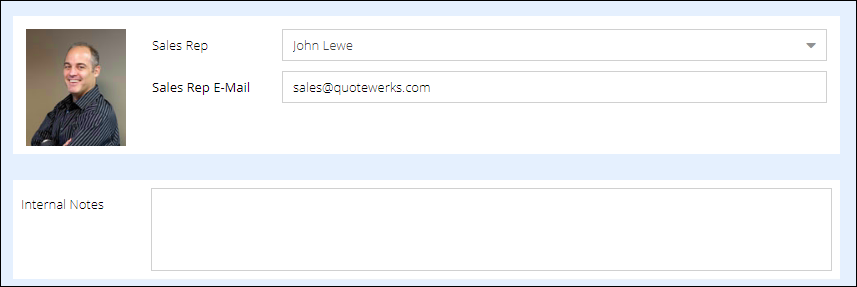 Additionally, underneath the document name the Sales Rep and sales rep email can be assigned. The sales rep field is a drop-down box which will enable you to add any QuoteWerks user from your installation to this quote: