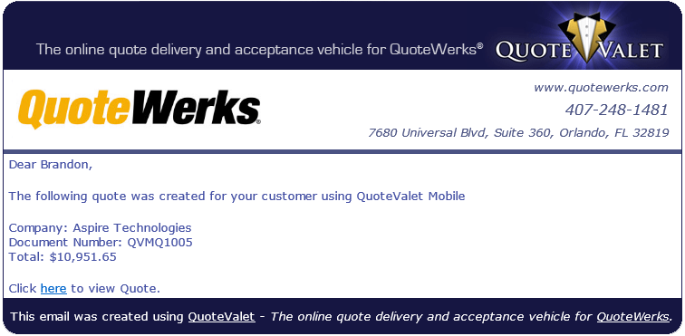 Below is the email that is sent to the customer when a QuoteValet Mobile quote is submitted.