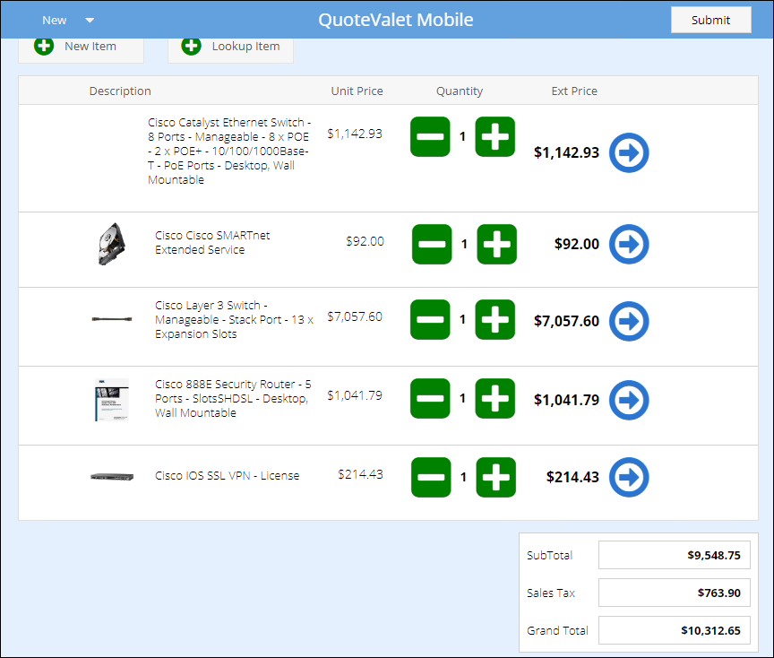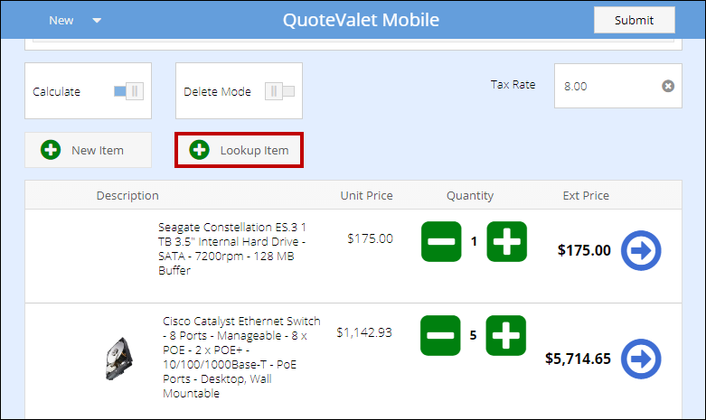 The “Lookup Item” option enables users to add additional products to the selected template from any other template located in QuoteValet mobile.: