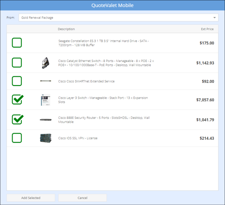 Once loaded all the products on the template will be available for selection to the current open quote. Select the items you would like to add to your document by clicking on the icon next to the item’s description. This will change to a green check marked icon indicating that the current product has been selected.