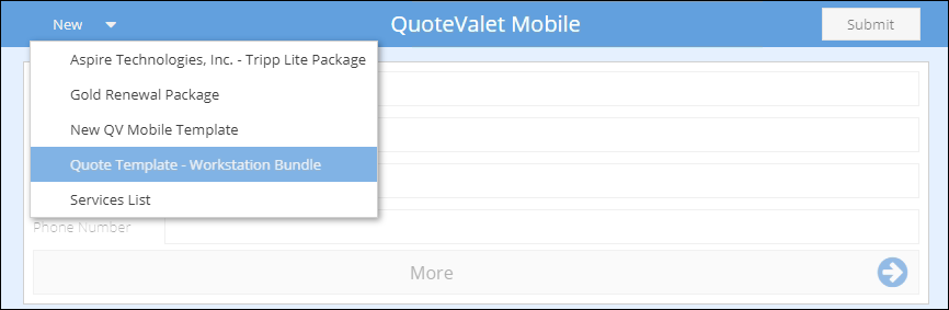 After clicking on the “New” button you will be able to choose the template that you would like to load into QuoteValet Mobile: