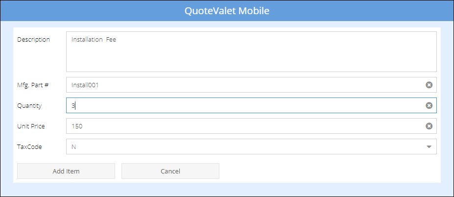 Users are also able to add items on the fly by clicking on the “New Item” option. This will let users add any items to the quote that are not currently listed in a document template. The fields available here are description of the item, the manufacturer part number, the quantity, the unit price (selling price) and the tax code (Y for taxable N for non-taxable).