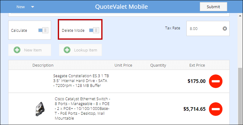 To remove items from the quote, click on the “Delete” icon right above the template information. Change it to “On” and then click on the