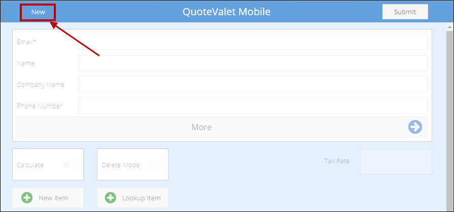 You will be brought to the main screen in QuoteValet Mobile, the WorkBook. This is where you can begin creating your quotes. To load your previously created templates, click on the “New” button at the top left of the window: