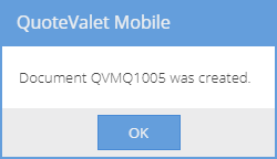 A confirmation window will appear once the document has been created in QuoteValet Mobile and the email has been delivered to the customer: