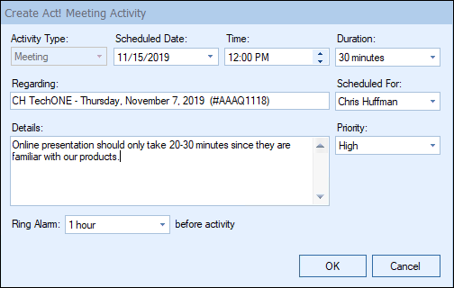 The Create ACT! Meeting Activity window will allow you to schedule a meeting for the contact from the opportunity or another contact on the account. You can set the date, time, duration, priority, add notes and an alarm before scheduling. You can also change the regarding field if you want to customize the meeting heading.