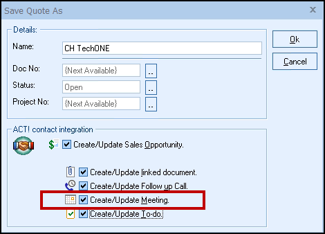 This feature will schedule a meeting in ACT!. The meeting will be listed under the Activities tab in the ACT! opportunity.