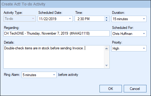 The Create ACT! To-Do Activity window will allow you to schedule a to-do for the contact from the opportunity or another contact on the account. You can set the date, time, duration, priority, add notes and an alarm before scheduling. You can also change the regarding field if you want to customize the To-do heading.