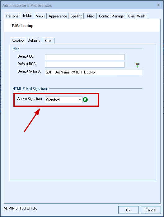 Choose from the drop-down list which email signature you would like to set as your default. When using an email signature macro in a template, you can use <<SignatureActive>> macro instead of <<SignatureStandard>>, <<SignatureShort>>, etc. When you use the <<SignatureActive>> macro, it will be replaced with whatever you set as the Active Signature here on this screen.