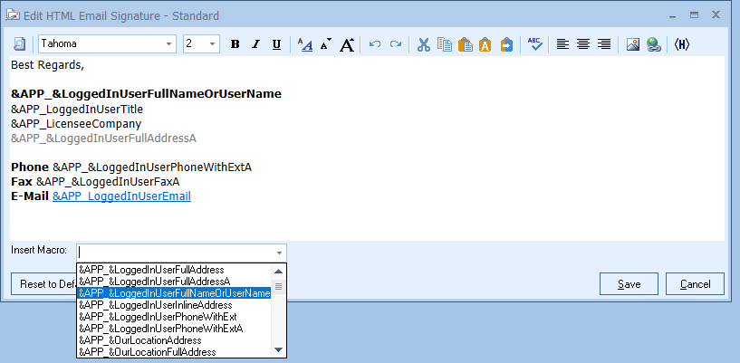 The signature editor also has a [Merge Macros and Preview] button on the toolbar when editing your html email signature. With this feature you can easily see an in-editor preview of what the macro fields will be merged to so you can see what the final output would look like.