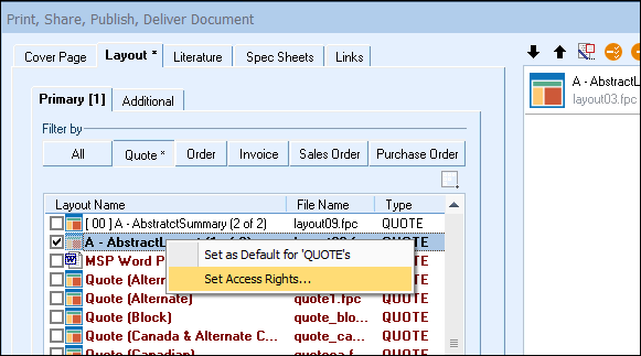 3.This will open the Set File Access Rights Window. Here you can select which of your users and groups are able to view and/or modify each layout or literature file you selected.