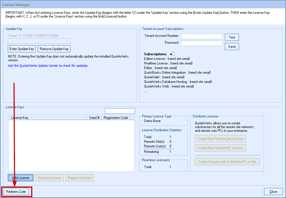 Important: The redemption code can only be used once. If it is accidentally used in an incorrect install, you will need to get a new code from the QuoteWerks Sales Team. |