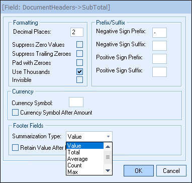 These fields hold numeric values. Numeric fields are used to print numeric values such as dollar amount, quantity, measurements, etc. The formatting options that are available with these fields include number of decimal places, currency symbol, prefix and suffix for positive and negative numbers, zero padding or suppression, and comma formatting.