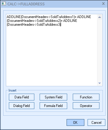 Step 6: Repeat this process starting at step 2 for SoldToAddress2 and SoldToAddress3. After SoldToAddress3, do not add a plus symbol. When completed, the formula builder window will display the formula “ADDLINE(DocumentHeaders->SoldToAddress1)+ ADDLINE(DocumentHeaders->SoldToAddress2)+ ADDLINE(DocumentHeaders->SoldToAddress3)”.
