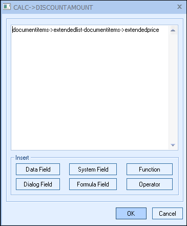 Step 4: Click on the [Data Field] button, then choose ExtendedPrice from the DocumentItems table. This will display the text “DocumentItems->ExtendedList-DocumentItems->ExtendedPrice” in your formula builder window.