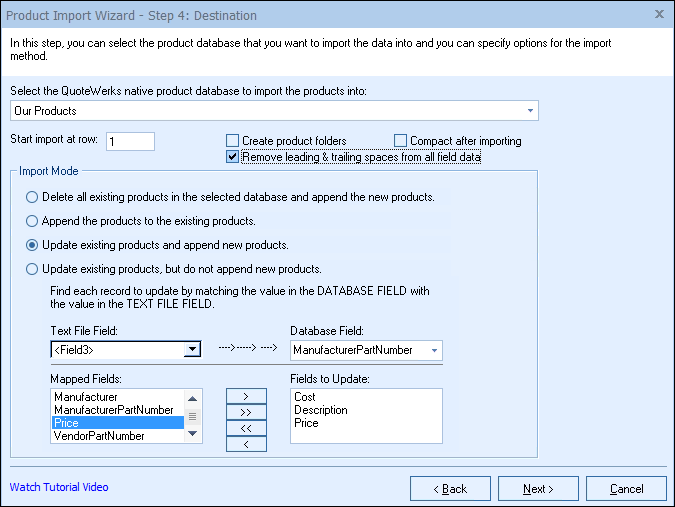 Select this option to update products that already exist in the database, and add the products that it does not find in the database. Select the column in the text file, and the database field that should be used to identify the matching products. You can also select which of the mapped fields you would like to update. This allows you to update only the price for example of existing products, for products that do not exist, they will be added, and all of their fields will be updated. This mode is particularly useful in cases where you have received a list from a manufacturer that contains all 6000 of their products and pricing. You have previously imported all 6000 of these products into your QuoteWerks product database. Now, 3 months later the manufacturer provides you with an updated list of their products and pricing and now they offer 6500 products. Using this feature, you can update the prices of the existing 6000 products in your QuoteWerks product database and you can add the 500 new products now contained in the update manufacturer price list.