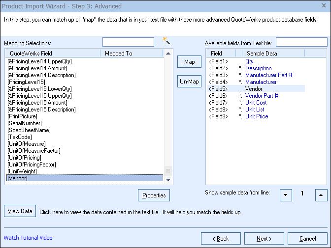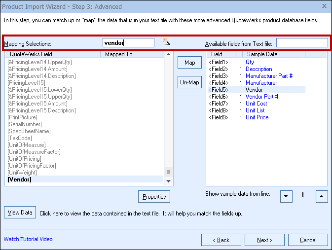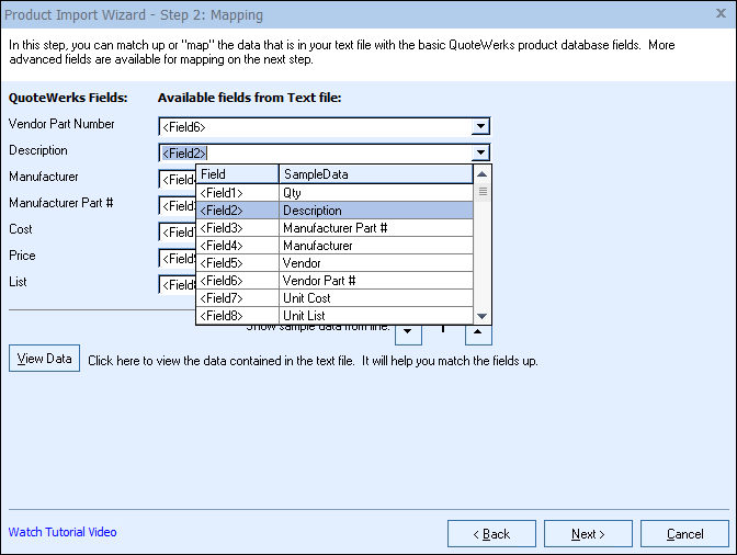 For example, click on the list box next to the “Vendor Part Number” label to select which column of data in the text file should be placed into the “Vendor Part Number” field in QuoteWerks.
