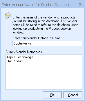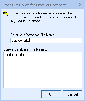 Enter the database file name you would like to use to store this vendors products. The database name will be the name of the database file that will be saved to the QuoteWerks directory. Example; vendor name “QuoteWerks” will become “QuoteWerks.mdb” in the QuoteWerks directory.