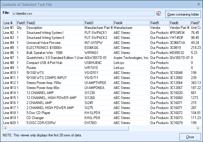 Often, the first row of data in delimited text files contains the column titles of the data that is contained in these columns. Using this “Start at Row” feature, you can instruct QuoteWerks to only import data starting at for example the second row since the second row will actually be the first row that contains data.