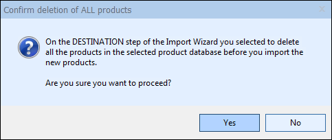 The “Confirm deletion” window will appear. This window will confirm your decision to delete all the existing products in the selected product database that you chose on the DESTINATION step of the Import Wizard.