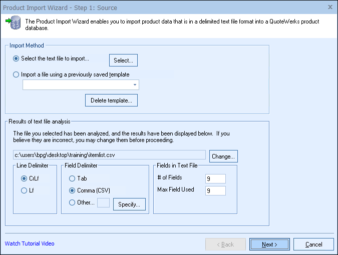 QuoteWerks will also attempt to determine how many columns of data there are in the text file. QuoteWerks will display the delimiter and number of columns that it found on this window. If you believe that QuoteWerks did not correctly detect the settings, you may change the settings.