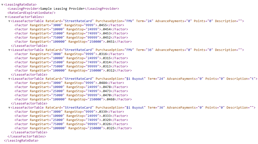 2. An example of this file is included below. You will need to edit this file with your leasing provider name, purchase options, term, advance payments, points, description, ranges, and the rates. Simply replace the existing values with your values and save the file. If you need to add additional ranges you can do so by copying the format shown below as well as adding other options such as 48 or 60 month options. Make sure you only change the options and not the formatting.