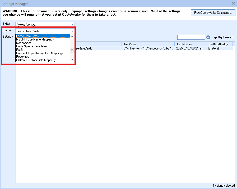 Important: Warning! This information is for advanced users only. Improper settings changes can cause serious issues. Only make changes if familiar with these settings and what needs to be changed. Additionally, most settings modified in this window will require a restart of QuoteWerks to take effect. The Settings Manager is available by navigating to Help -> About -> Settings Manager. |