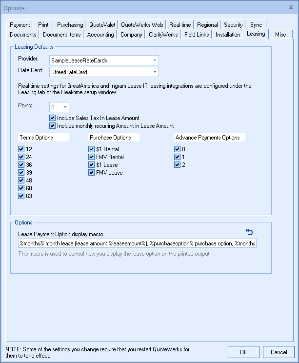 Once you have setup one or multiple leasing companies in QuoteWerks, you can set a default for the leasing options to be used on quotes. These options will be used on the quotes created in QuoteWerks, but can be changed on a per quote basis.