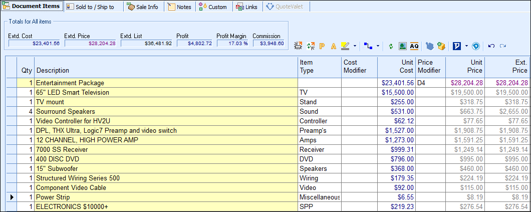 When a group is created, a group Header line item is inserted before the line items that make up the group. These line items that are in the group are called group members. The sum of the prices of the group members are placed into the group Header line item as a single unit price. The individual group-member prices do not print by default; however, you can change the Hide Price attribute to print the individual prices. The quantity column of the group header has a yellow background, and the description cell of all of the line items in the group will have a yellow background.