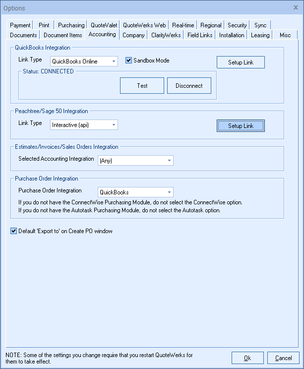 With this drop-down box, you'll select QuickBooks or Sage 50 (Peachtree) as your accounting package that will automatically receive the estimate, invoice, or sales order you create in QuoteWerks.